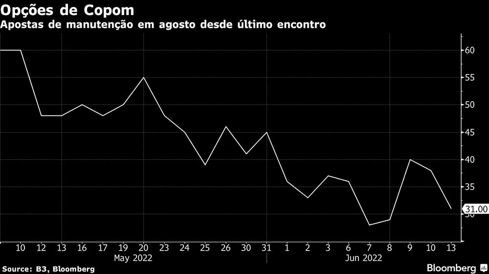 No fechamento de sexta, os contratos implicavam uma probabilidade de 38% de manutenção da taxa básica em agosto, contra 25% de uma alta de 0,25 ponto percentual (p.p.) e outros 35% de chance de uma elevação de 0,5 p.p., segundo dados da B3.