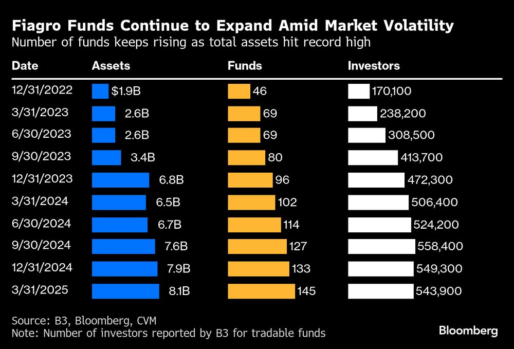 Conocidos como Fiagros, los instrumentos de crédito funcionan como un fondo cerrado, reuniendo capital principalmente de inversores minoristas y asignándolo a una serie de activos agrícolas, normalmente cuentas por cobrar. Desde su lanzamiento en 2021, han crecido hasta gestionar activos por valor de 44.700 millones de reales (US$8.100 millones) y financiar desde gigantes alimentarios como JBS NV y BRF SA hasta pequeños productores rurales.