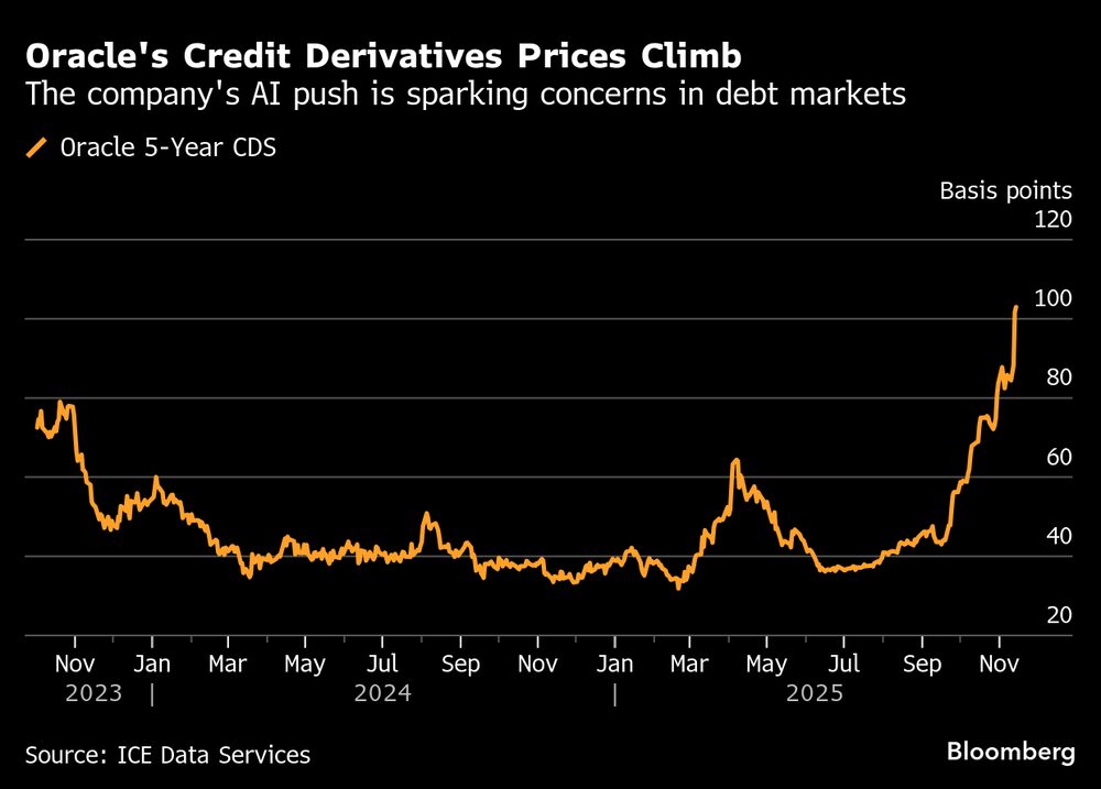 Los bancos y los gestores de dinero están negociando más derivados que ofrecen pagos si las empresas tecnológicas individuales, conocidas como hiperescaladores, incumplen su deuda. La demanda de protección crediticia ha duplicado con creces el coste de los derivados de crédito sobre los bonos de Oracle Corp. (ORCL) desde septiembre. Mientras tanto, el volumen de negociación de los swaps de incumplimiento crediticio vinculados a la empresa se disparó a unos US$4.200 millones durante las seis semanas que finalizaron el 7 de noviembre, según el estratega de crédito de Barclays Plc, Jigar Patel. Esta cifra es superior a los menos de US$200 millones del mismo periodo del año pasado.