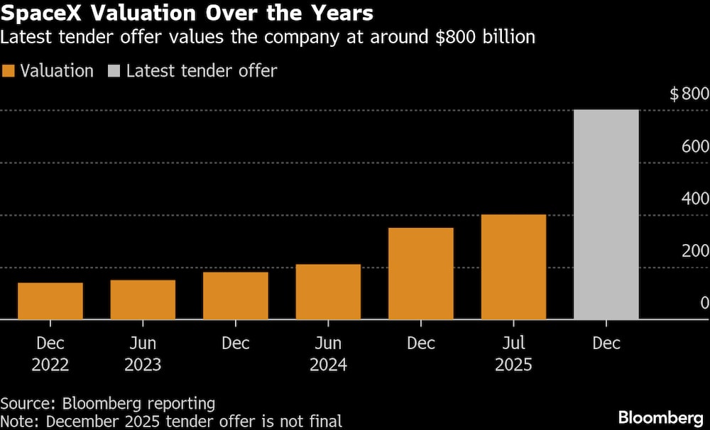 “Se trata de una empresa N de 1 con una competencia real limitada o nula de las Siete Magníficas y que probablemente tendrá la mayor oferta minorista de todos los tiempos”, afirmó Jeremy Abelson, fundador y gestor de carteras de Irving Investors, cuya firma es inversora en SpaceX. “La valoración no tendrá, ni tiene por qué tener, sentido cuando salga a bolsa”.