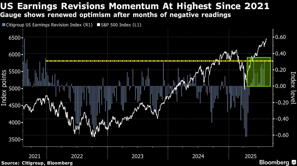 Un índice de Citigroup Inc (C) que rastrea la relación entre aumentos y recortes en las estimaciones de ganancias por acción en EE.UU. está en su nivel más alto desde diciembre de 2021. Y la tendencia es igual de sólida entre las empresas que recientemente publicaron sus propias perspectivas. Un indicador de orientación futura que compara las proyecciones corporativas con el consenso de Wall Street se encuentra en su segundo nivel más alto en casi cuatro años, según datos de Bloomberg Intelligence.