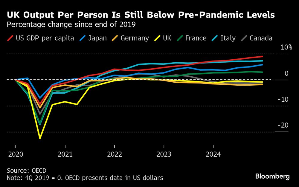 “Las prestaciones por enfermedad son más generosas que las prestaciones por desempleo, así que todo el mundo quiere aparentar estar enfermo”. La productividad, el manantial del nivel de vida, se desplomó y el PIB per cápita aún no ha recuperado los niveles anteriores a la pandemia.