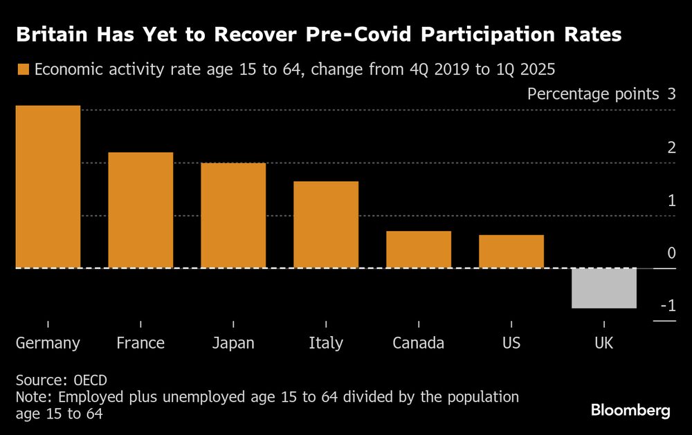 La mayoría de los países descubrieron que la gente tenía más ganas de trabajar después de la pandemia. Únicamente en el Grupo de los Siete, la participación cayó en el Reino Unido, ya que más de un millón de personas pasaron a recibir prestaciones sanitarias y por incapacidad, lo que supuso un coste de GBP$13.000 millones al año. Sin embargo, un informe de la Cámara de los Lores no encontró pruebas de un empeoramiento de la salud en el conjunto de la población.