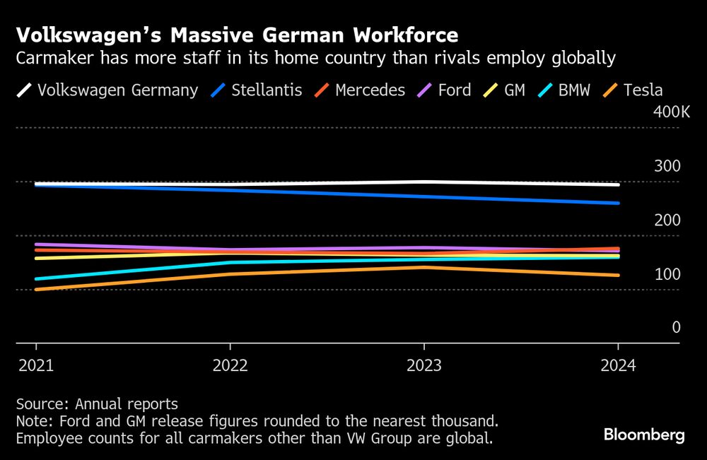 En su informe, Volkswagen también reveló que terminó el año con 293.338 personas en plantilla sólo en Alemania. Eso es más de lo que Stellantis NV (STLA), el segundo mayor fabricante de automóviles de Europa, emplea en todo el mundo.